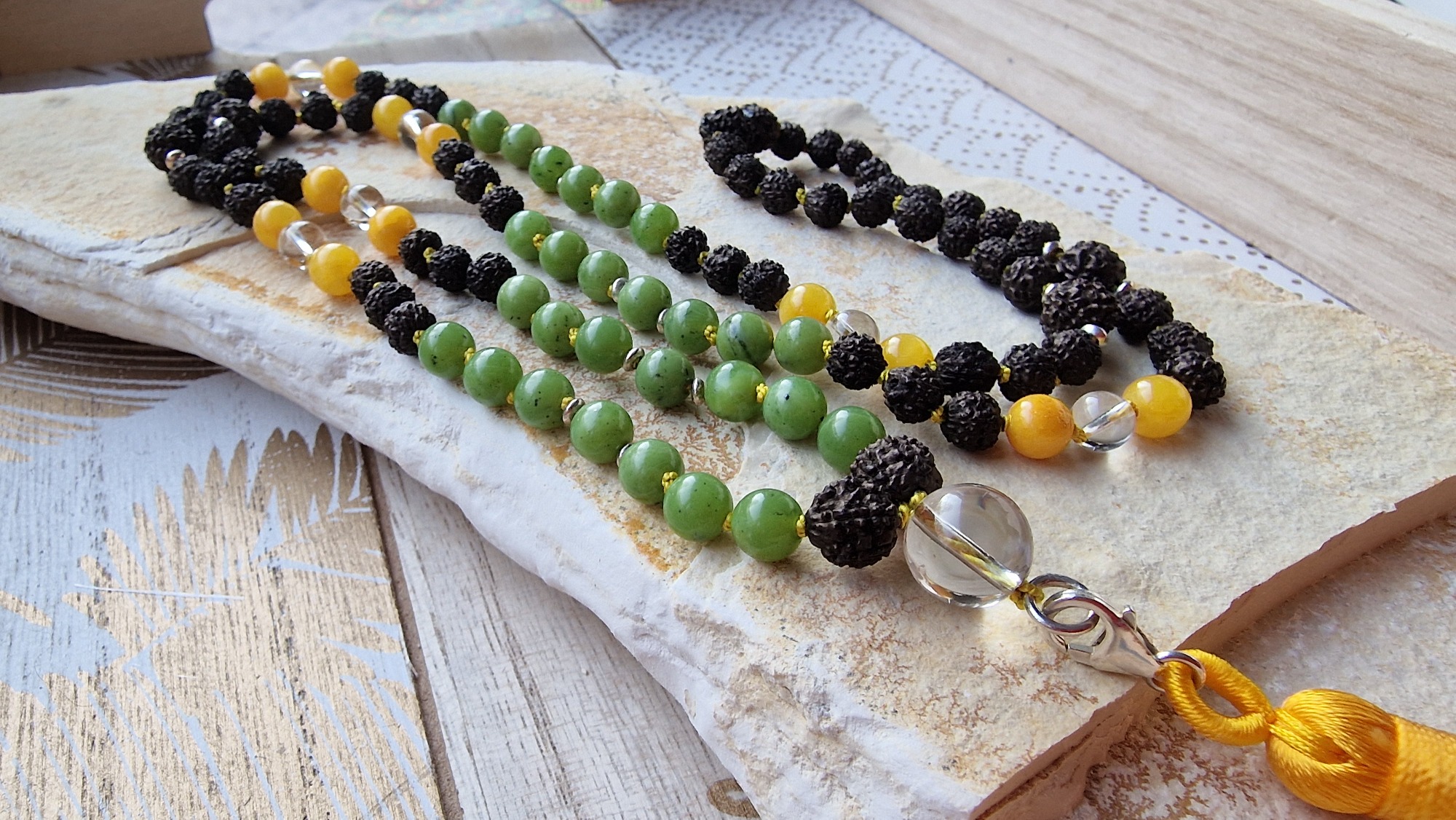 Malaketten sind im Hinduismus und Buddhismus Gebetsketten. Diese besonderen Ketten fertige ich gerne im Kundenauftrag oder leite im Workshop an, diese selbst herzustellen.